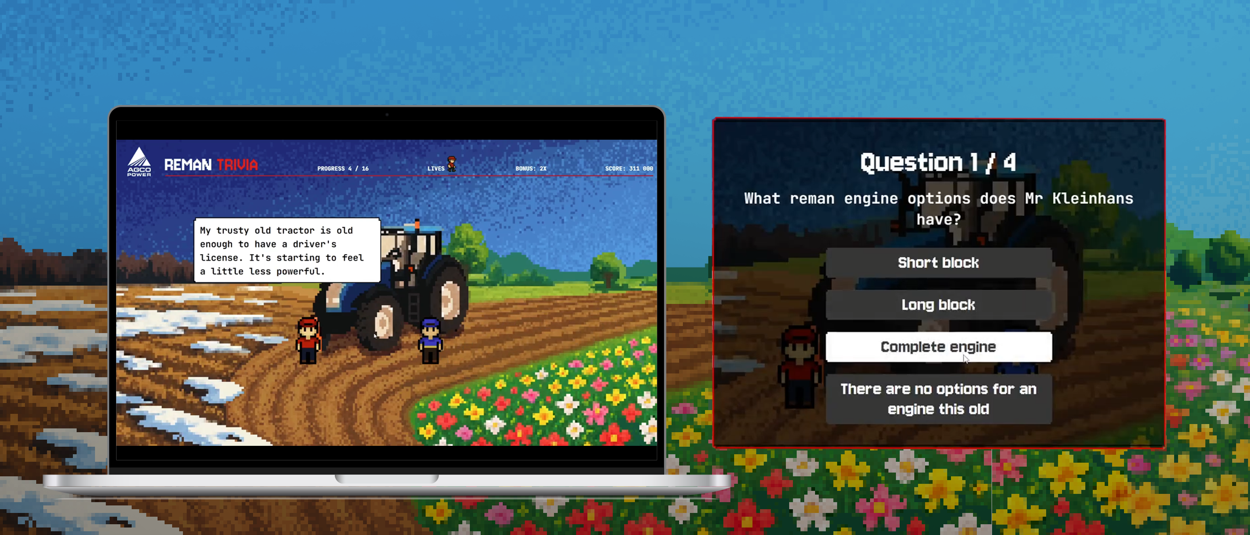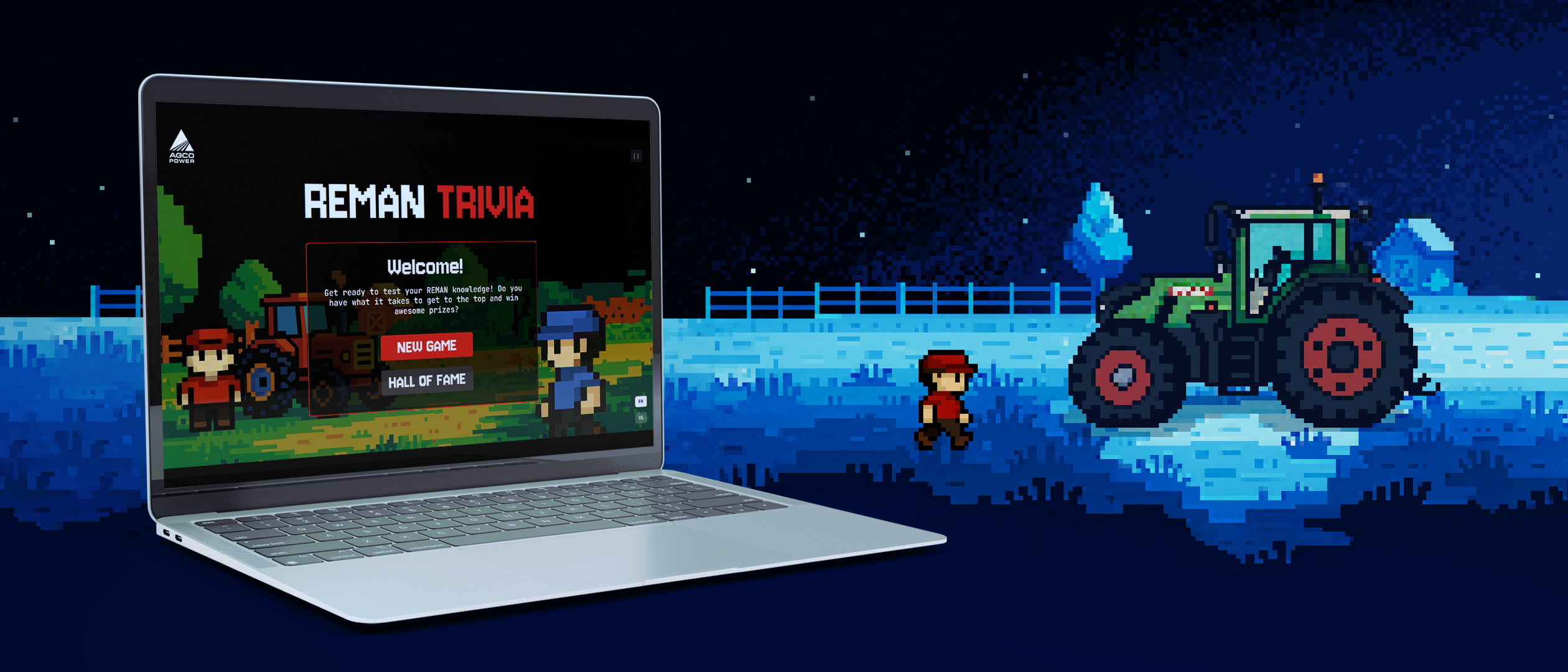 Rakensimme AGCO Powerille Reman Trivian. Teimme siitä kevyen ja messuympäristöön optimoidun pelillisen sovelluksen, joka argumentoi Remanin taloudellisuutta, ekologisuutta, helppoutta, nopeutta ja luotettavuutta.