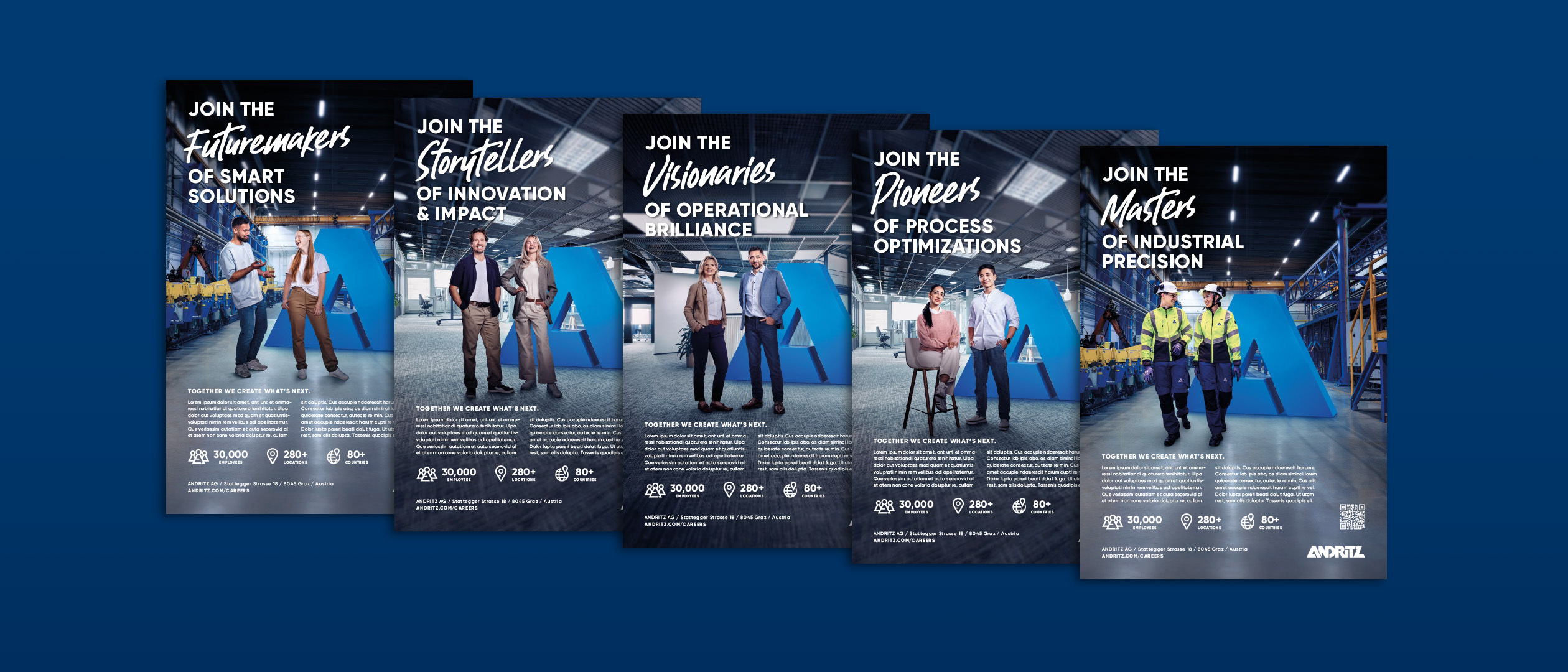 We created a unified visual world where the distinctive ANDRITZ “A” element acts as a strong and recognizable anchor. At the same time, we developed tailored messaging for different target groups, ensuring relevance across roles, expertise levels, and career stages.